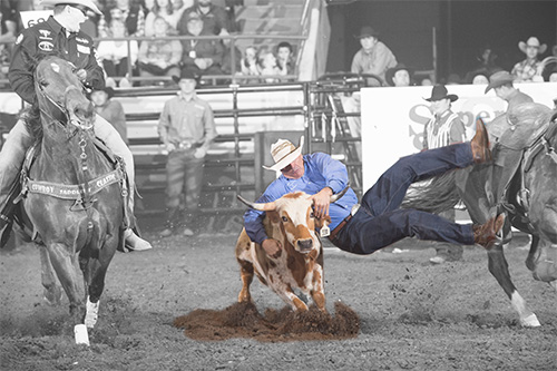 Drop from a horse, grab a steer by the horns and wrestle it to the ground. It may seem like a simple concept, however, coordination between a steer, two cowboys and two horses requires impeccable timing, technique and strength. The steer wrestler begins by backing into the box on the left side of the steer. The race is on at the cowboy’s nod! Both the steer wrestler and his hazer, the person guiding the steer in a straight path, set out parallel to obtain the best position. The cowboy dismounts when even with the steer by dropping from his horse, positioning his right arm around the right side of the steer while the left hand grabs the inside horn. Once dismounted, the steer wrestler digs his heels into the dirt to stop the forward acceleration of the steer in order to lay it on its side with all four legs pointed in the same direction. Time begins when the cowboy leaves the box. The flag judge on horseback in the arena will drop his flag when the steer is down and the clock stops.